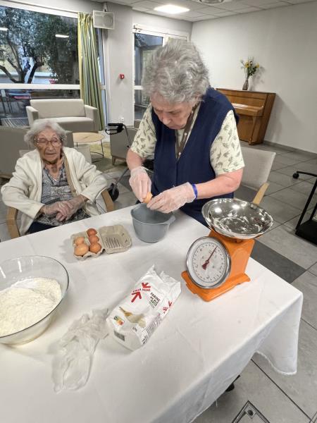 Dans une ambiance chaleureuse et pleine de bonne humeur, chacun a mis la main à la pâte: peser les ingrédients, mélanger, façonner les boules de pâte... Les gestes du quotidien sont revenus naturellement, tout en favorisant la stimulation motrice et sensorielle.
