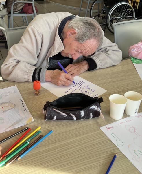 Pour cette première rencontre intergénérationnelle, le thème d’activité choisi s’est centré autour du dessin. Le dessin est une technique très utilisée auprès des enfants car il permet de développer le sens artistique, d’affirmer sa personnalité mais c’est aussi un moyen d’acquérir des habiletés qui préparent à l’écriture. Résidents et écoliers avaient pour consignes de se dessiner l’un l’autre, un bon moyen pour faire rapidement connaissance tout en travaillant sur la perception de la jeunesse et du vieillissement.
